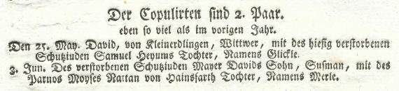 Die Bilder sind aus dem „Verzeichnis der in der Hochfürstlichen Residenzstadt Oettingen unter der Juden-Gemeinde in dem verflossenen 1800. Jahr Neugebohrenen, Copulierten und Verstorbenen" entnommen.