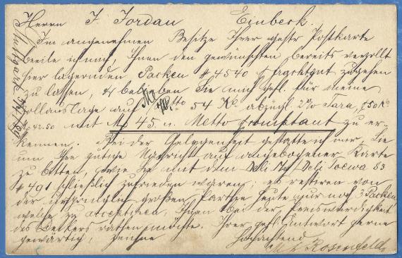 Postkarte geschäftlicher Art von M. L. Rosenfeld, - versandt am 5. April 1889 - Kartenrückseite