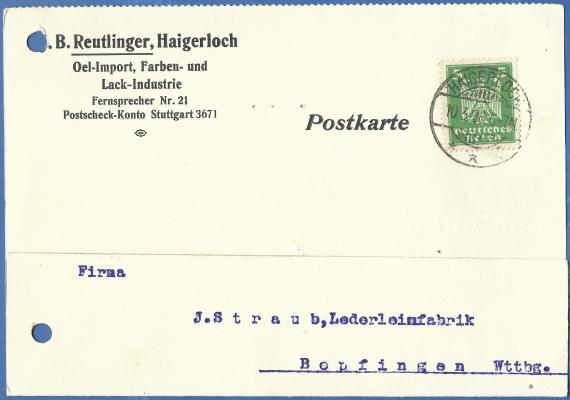 Geschäftspostkarte - J. B. Reutlinger, Oel-Importe, Farben- und Lack-Industrie, Haigerloch, - versandt am 10. März 1926