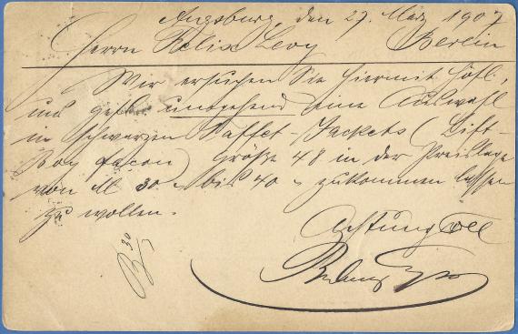 Postkarte geschäftlicher Art der Fa. Braumann & Günzburger an Herrn Felix Levy in Berlin, Jägerstraße 45-48, - versandt von Augsburg am 27.März 1907
