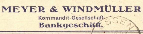 <p>Im Adressbuch der Stadt Essen aus dem Jahr 1936 findet sich folgender Eintrag: Meyer & Windmüller, Bankgeschäft, Schillerstraße 1 - 5, Tel. 26947. Das Bankgeschäft Meyer & Windmüller würde geführt von Louis Meyer und Paul Windmüller. Als stille Teilaber waren der Magdeburger Bankenverein und die Fa. Meyer & Söhne beteiligt. Das Bankgeschäft hatte seinen Sitz zuerst in der Lindenallee, danach in der Schillerstraße und zuletzt in der Hedwigstraße.Nach dem Tod von Louis Meyer 1936 war Paul Windmüller der Inhaber des Bankgeschäfts. Der 1881 in Lippstadt geborene Paul Windmüller war verheiratet mit Anna Windmüller, geb. Coppel,geb. 6.Juli1892 - gest. 21.Februar 1920. Das Ehepaar hatte zwei Söhne - Hans Zwi, geb. 1915 und Erik, geb.1919. 1938 kam es zur Liquidation des Bankgeschäfts und Paul Windmüller emigrierte mit seiner 2. Frau Helene, geb. Philipps nach England und 1940 in die USA. Sohn Hans-Zwi emigrierte bereits 1935 nach Palästina, Sohn Hans 1938 in die USA.</p>