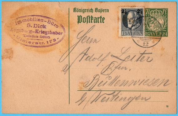 Postkarte geschäftlicher Art vom "Immobilien-Büro S. Dick, Augsburg-Kriegshaber,Ulmer Str.172 ", - versandt am 3. April 1919 nach Buttenwiesen