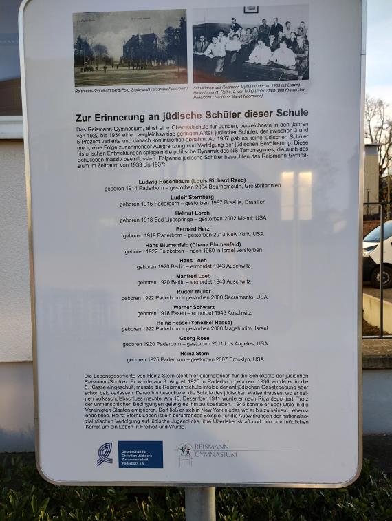 <p>Im Schuljahr 2023/2024 hatte sich die Klasse 10a des Paderborner Reismann-Gymnasiums mit dem Thema „Antisemitismus, Rassismus und Diskriminierung in OWL – damals und heute“ auseinandergesetzt. Ein Ergebnis ist eine mit Unterstützung des Stadtarchivs und der Gesellschaft für Christlich-Jüdische Zusammenarbeit (GCJZ) entwickelte Gedenktafel (Bilder) am Schulgebäude am Reismannweg. Die Gedenktafel erinnert an zwölf jüdische Schüler in den Jahren 1933 - 1937, die die damalige Reismann Oberrealschule zwangsweise verlassen mussten. Die wichtigste Aufgabe der Schule bestand für die Nationalsozialisten darin, den Kindern die Rassenideologie der Nationalsozialisten schon möglichst früh zu vermitteln. So sah Hitler in der Schule nur eine Vorstufe für die Wehrmacht.</p><p>Der Anteil an jüdischen Mitschülern an der damaligen Oberrealschule lag zwischen 1922 und 1933 zwischen 3 und 5 Prozent. 1933/34 wurde die Verdrängung der Juden aus den höheren Schulen eingeleitet. Ab 1937 gab keinen jüdischen Schüler mehr.</p>