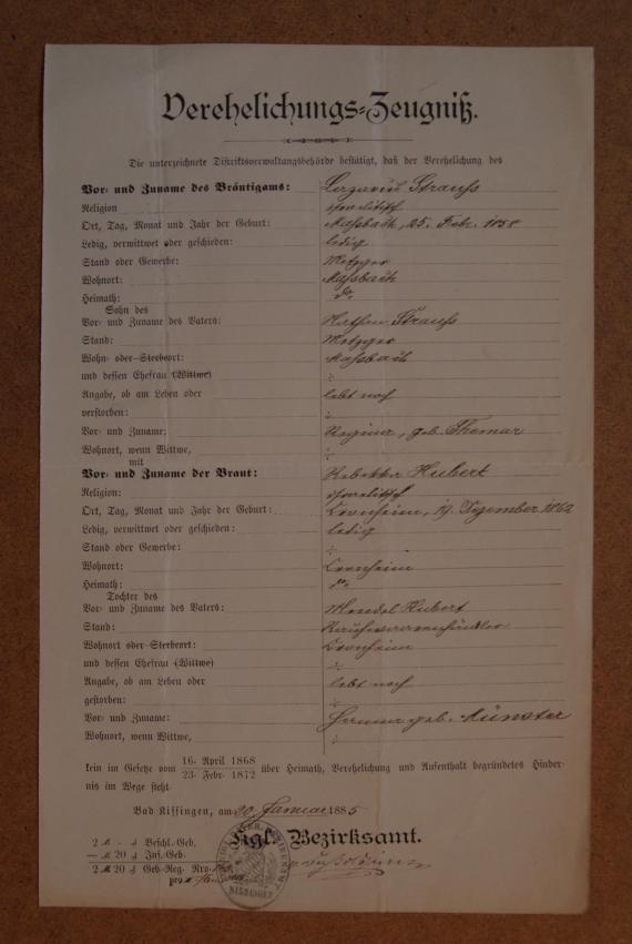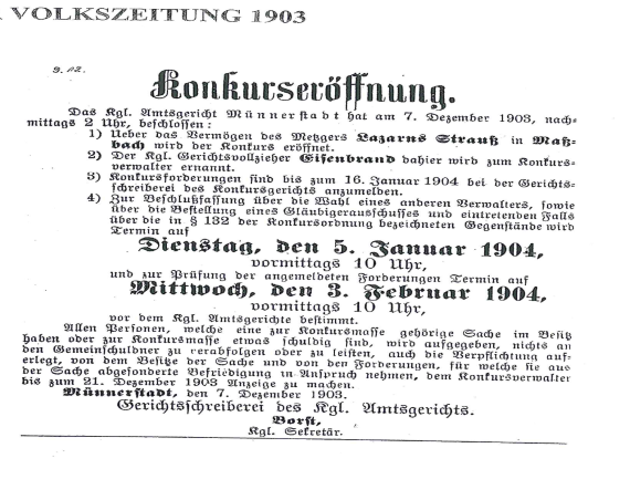 <p>Um 1883 erwarb der Metzger Lazarus Strauß das Haus Nr. 112 in Maßbach. Er war am 25. Februar 1858 in Maßbach geboren, Sohn des Metzgermeisters Nathan Strauß aus Oberlauringen und dessen Frau Rachel geb. Themar aus Haus Nr. 90. Seine Ehefrau Rebekka Hubert, geboren am 19. Dezember 1862 in Cronheim bei Gunzenhausen, zog mit ihm in das neu erworbene Haus ein.</p><p>In HN 112 kamen ihre drei Kinder zur Welt: Joseph Eugen (4. Dezember 1885), Siegfried (15. Juli 1892) und Rosa (21. Juni 1901). Über viele Jahre war das Haus Mittelpunkt des Familienlebens. Lazarus betrieb sein Metzgerhandwerk, Rebekka führte den Haushalt und erzog die Kinder.</p><p>1911 veräußerte die Familie das Haus und zog in das Mietshaus Nr. 86. Die wirtschaftlichen Schwierigkeiten der Zeit belasteten die Familie schwer; 1914 geriet Lazarus Strauß in Konkurs. Am 8. August 1919 starb er im Alter von 61½ Jahren. Seine Witwe Rebekka lebte danach in sehr bescheidenen Verhältnissen und zog später in das gemeindeeigene Haus Nr. 161, die sogenannte „Judenschule“, in der sich auch die Mikwe befand. Dort verbrachte sie ihren Lebensabend, traf sich gelegentlich mit Nachbarinnen zum Kaffeekränzchen und blieb bis ins hohe Alter fest in die Dorfgemeinschaft eingebunden.</p><p>Das Schicksal der Kinder führte in verschiedene Richtungen: Siegfried starb 1935 in Stuttgart im Alter von nur 43 Jahren, Joseph Eugen zog nach München und wurde 1942 deportiert und ermordet. Rosa emigrierte in die USA, lebte in New York und nannte sich später Rosel Royce. Sie war die einzige Überlebende der Familie.</p><p>Vor dem letzten Wohnort von Rebekka Strauß erinnert heute ein Stolperstein an sie und an die jüdische Geschichte von Haus Nr. 112, das über Jahrzehnte hinweg ein stilles Zeugnis jüdischen Familienlebens in Maßbach war.</p>
