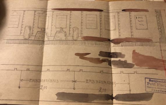 Eine gezeichnete Ansicht einiger Grabsteine des ehemaligen neuen Jüdischen Friedhof