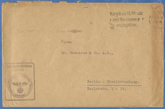 Envelope addressed to the company Dr. Cassirer & Co. A. G. in Berlin . Charlottenburg, Keplerstraße 1 - 10, - mailed on March 24, 1938.