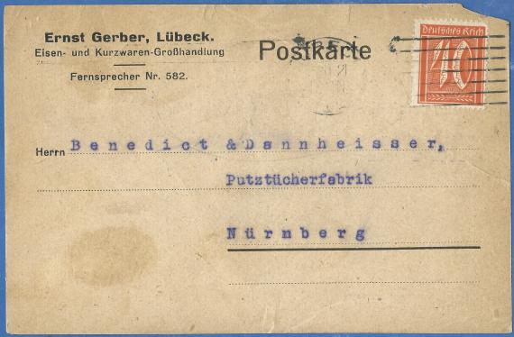 Postcard of business nature to " Benedict & Dannheisser, Putztücherfabrik " in Nuremberg - mailed on November 22, 1921 - back of card