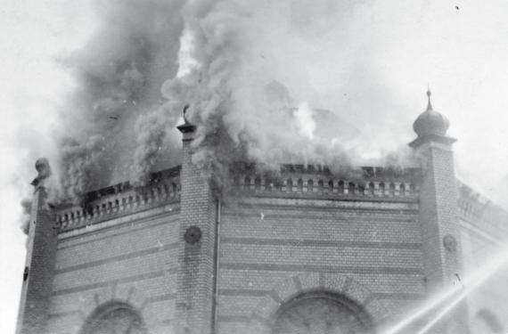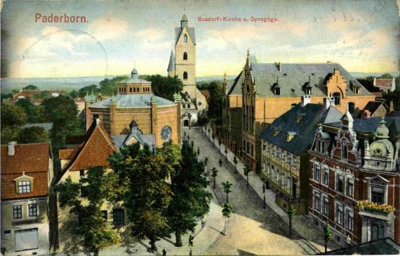 <p>octagonal central building Last use: residential and commercial buildings</p><p>The synagogue, built in 1882 (Am Busdorf), was an octagonal building in the oriental style, constructed of yellow bricks with a copper roof, according to plans by the architect A. Baumann; it had space for approximately 300 people, about 190 in the nave and 100 in the women's gallery. In 1905, the synagogue was extended with a western addition containing galleries, and in 1928 it was re-roofed with copper plates. On November 10, 1938, the interior burned down, and it was demolished shortly thereafter.</p><p>A virtual reconstruction of the synagogue can be viewed under "Media."</p>