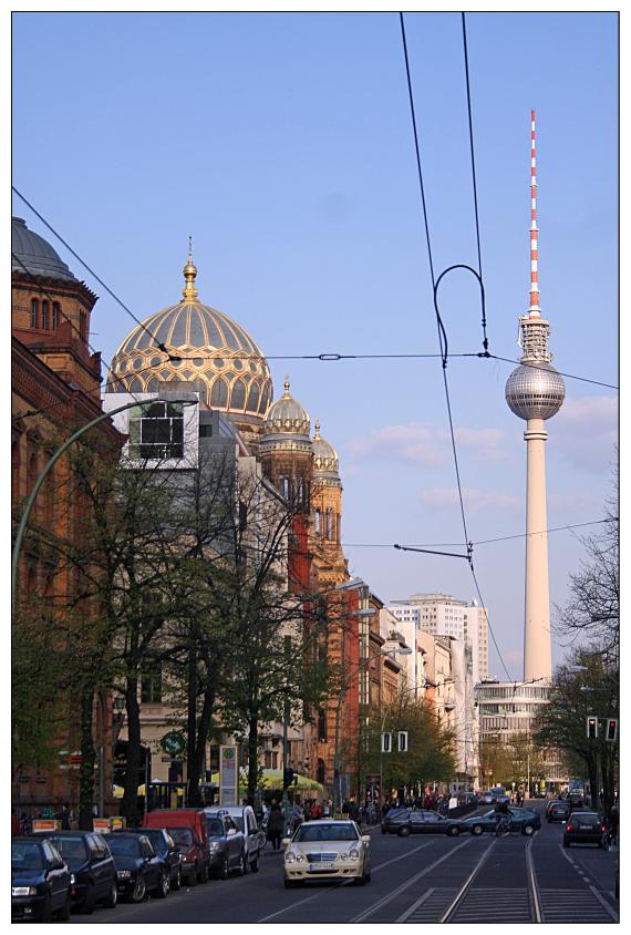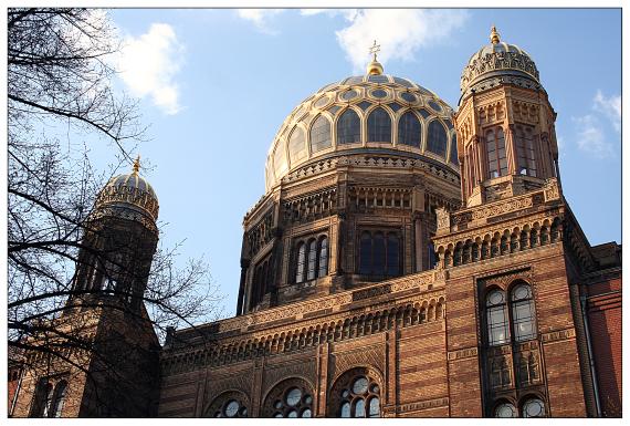 The so-called New Synagogue in Oranienburger Straße, which can already be spotted from the S-Bahn with its 50m high golden dome, was once the largest Jewish house of worship in Germany. It had several thousand seats and was considered the most magnificent synagogue in Berlin. The synagogue was built according to the designs of architects Eduard Knoblauch and August Stüler and was finally completed in 1866 after seven years of construction. While the liberal house of worship was relatively spared until 1940, it was almost completely burned out after a bombing raid in November 1943. After demolition of the synagogue's main room in 1958, reconstruction of the building began thirty years later. The front building was reconstructed, but the facade facing the backyard was modernized with a large glass facade. On May 7, 1995, the building was solemnly inaugurated under the name "New Synagogue - Centrum Judaicum". The New Synagogue does not, as one might expect, primarily have the function of a Jewish house of worship. Rather, it is a place that reflects the history of Berlin Jewry. Parallel to the inauguration of the house the permanent exhibition "Tuet auf die Pforten", which shows the history of the synagogue as well as this very history of Berlin Jewry, was opened. The associated "Foundation New Synagogue Berlin - Centrum Judaicum" is also located in the premises and is responsible, among other things, for the coordination and planning of the permanent and temporary exhibitions. Furthermore, there is a small synagogue room as well as a mikvah (a ritual immersion bath).
